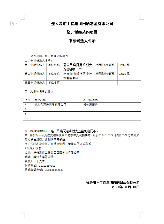 連云港市工投集團(tuán)日曬制鹽有限公司聚乙烯繩采購(gòu)項(xiàng)目中標(biāo)候選人公示