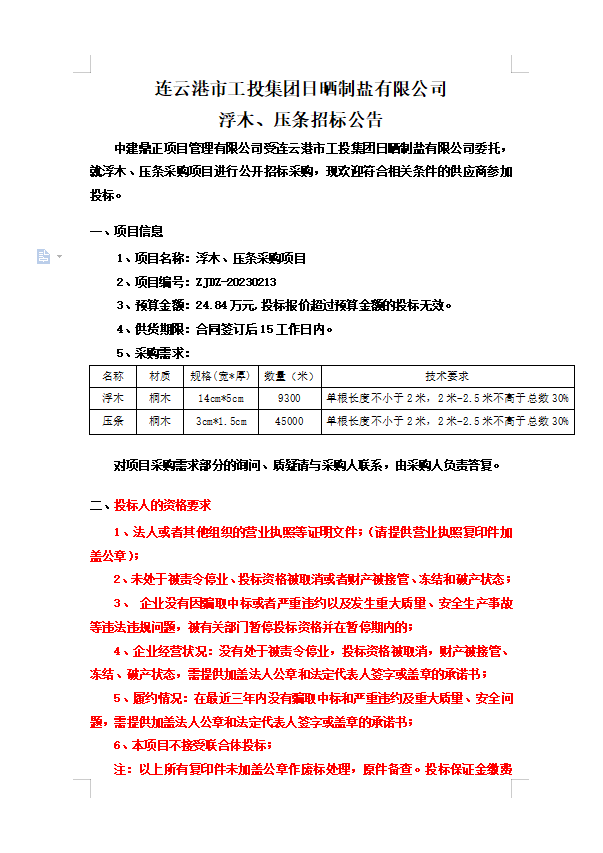 連云港市工投集團(tuán)日曬制鹽有限公司浮木、壓條招標(biāo)公告