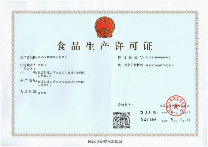 5月15日,我公司順利獲得《食品生產(chǎn)許可證》,成為江蘇省第一家獲得《食品生產(chǎn)許可證》的國家食鹽定點生產(chǎn)企業(yè)。