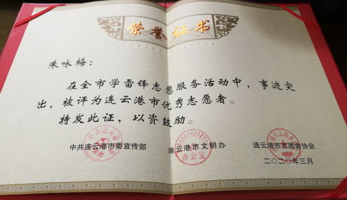 參加疫情防控志愿服務(wù)以來,朱詠梅一天都沒有休息,已為超過2萬名旅客檢測體溫。由于事跡突出,在全市學雷鋒志愿服務(wù)活動中,被評為連云港市優(yōu)秀志愿者。工作期間,渴了不敢喝水,餓了就吃泡面,雖然很辛苦,但是她覺得很自豪,她說:“我是一名預(yù)備黨員,也是一名國企職工,比起那些奮戰(zhàn)在疫情防控一線的醫(yī)務(wù)人員,我做的太少了;當前,全國人民都投入到新冠肺炎疫情防控工作中來,我只是為防控工作貢獻了自己的微薄的力量,我相信只要我們團結(jié)一心、眾志成城,就一定能早日戰(zhàn)勝疫情,早日打贏這場沒有硝煙的戰(zhàn)爭!(凌家佳)