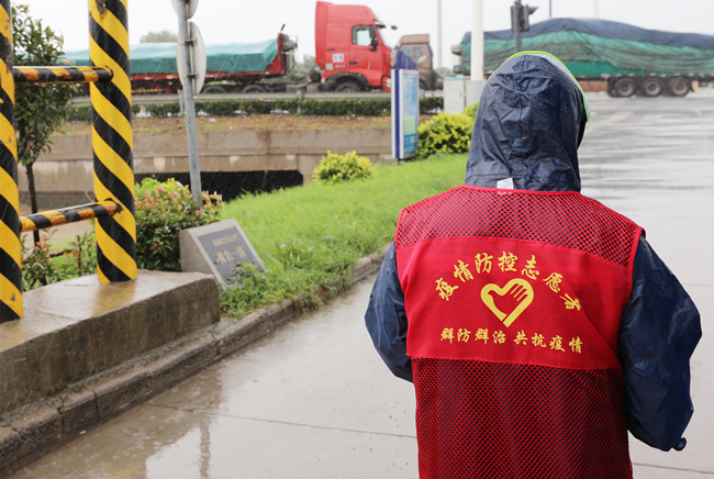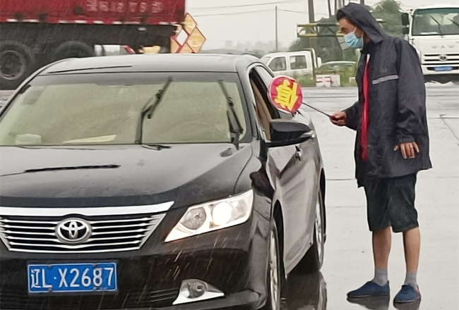 “您好,請出示一下行程碼,做下登記?!眻?jiān)守在崗位,逆風(fēng)迎雨,對車輛進(jìn)行逐一登記和體溫檢查,絲毫沒有受天氣的影響。