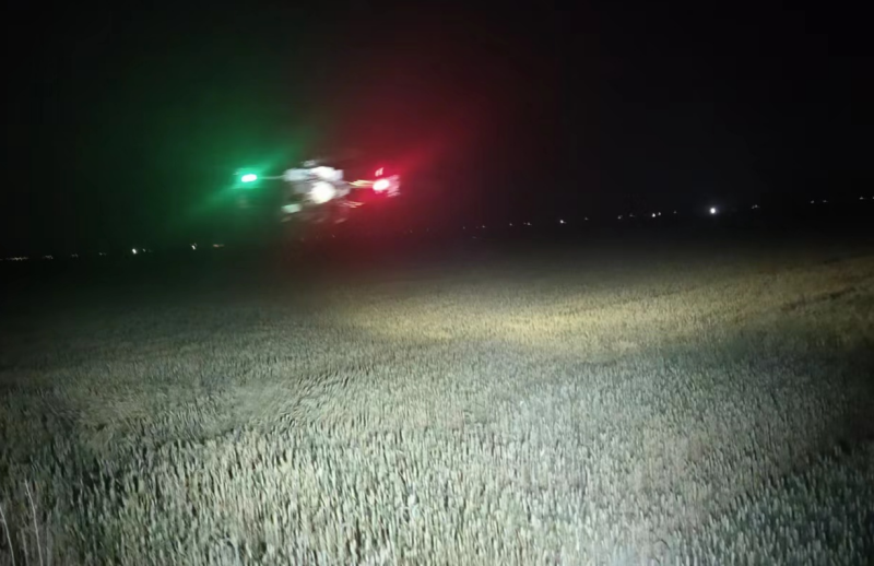 加班加點(diǎn)抓防治。晚上9點(diǎn),大新農(nóng)場(chǎng)組織2臺(tái)無人植保機(jī)在耐鹽堿小麥地實(shí)施小麥化噴施葉面肥作業(yè)。