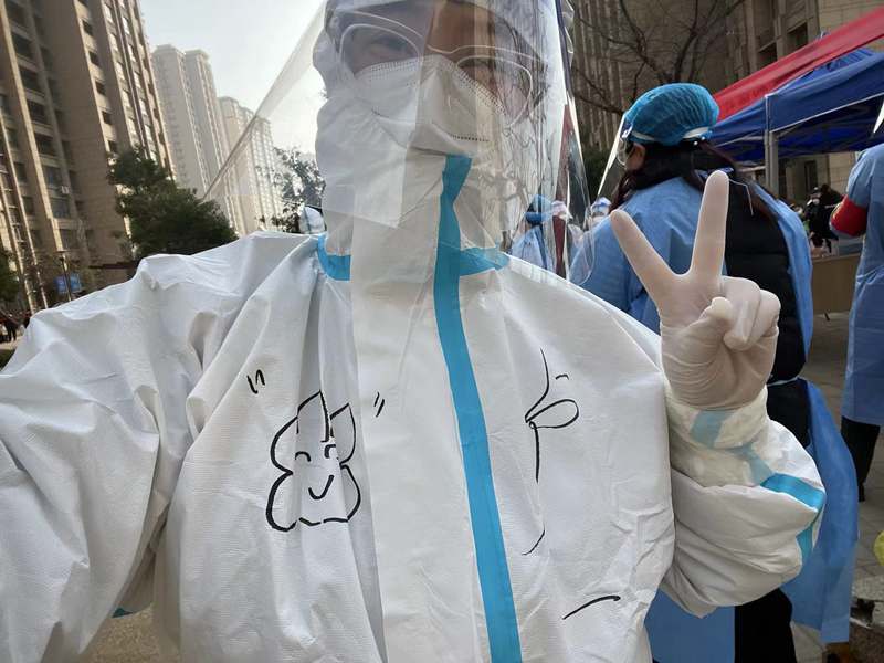 ? 312日,晴,800到達(dá)社區(qū)核酸采樣點(diǎn),準(zhǔn)備上崗,社區(qū)負(fù)責(zé)人給我們進(jìn)行了“防護(hù)服穿脫”及防疫知識(shí)的講解學(xué)習(xí)等一系列十分細(xì)致地培訓(xùn)后,有點(diǎn)興奮的穿好“大白服”,帶上手套、頭套和面罩,社區(qū)阿姨還幫我在衣服上畫上了可愛的涂鴉;