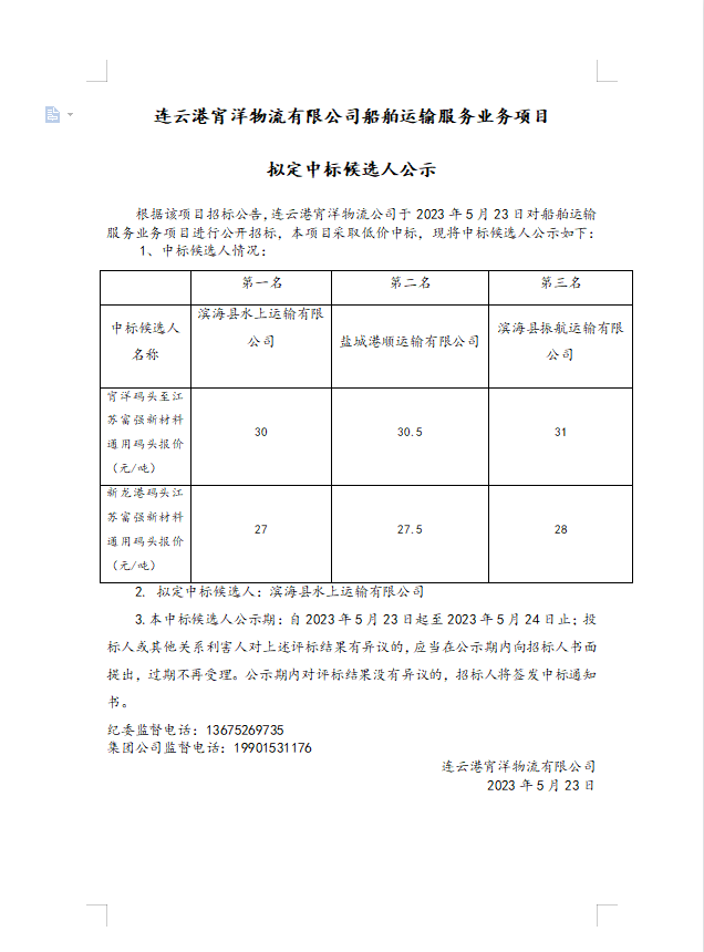 連云港宵洋物流有限公司船舶運(yùn)輸服務(wù)業(yè)務(wù)項(xiàng)目擬定中標(biāo)候選人公示