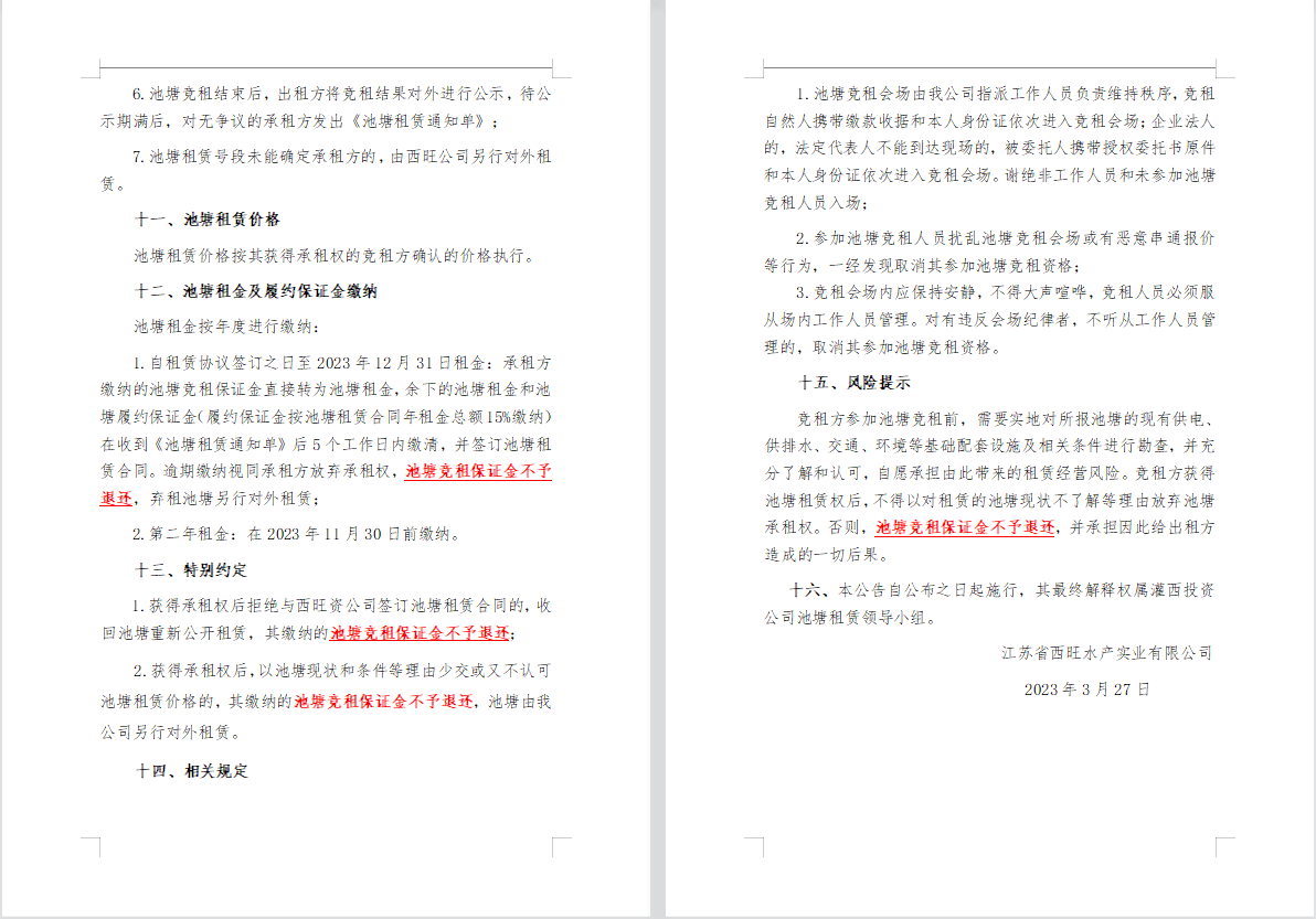 江蘇省西旺水產(chǎn)實業(yè)有限公司2023年度淡水養(yǎng)殖池塘公開競租第二次公告