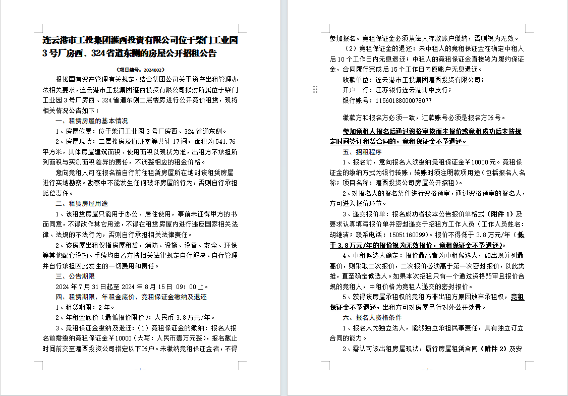 連云港市工投集團(tuán)灌西投資有限公司位于柴門(mén)工業(yè)園3號(hào)廠房西、324省道東側(cè)的房屋公開(kāi)招租公告
