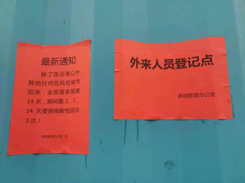 養(yǎng)殖管理辦公室迅速反應(yīng),成立防疫領(lǐng)導(dǎo)小組,加強(qiáng)值班值守,設(shè)置疫情防控設(shè)置隔離點(diǎn)、外來人員登記點(diǎn),張貼疫情動態(tài)通知。養(yǎng)殖辦全員到“塘頭”排查是否有人員與中高風(fēng)險(xiǎn)地區(qū)回連人員的接觸史(包括家人和周邊鄰居)和疫苗接種情況;對來往車輛和人員進(jìn)行逐一登記排查,宣傳防疫注意事項(xiàng);并要求養(yǎng)殖戶不得雇傭除了連云港以外人員干活、不得讓除了連云港以外人員或車輛在池塘進(jìn)出。